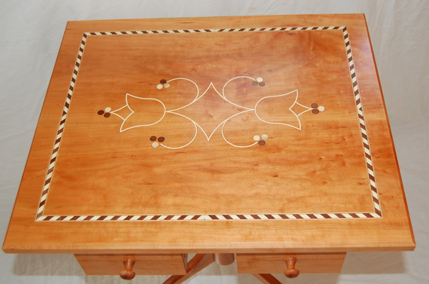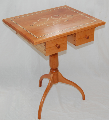 Shaker style sewing table Table is made of cherry and maple. Table top is inlayed with line and berry design.The drawers are made with hand cut dovetails and are accessible from either side of the table. 27.5" H x 21.5" W x 18" D |